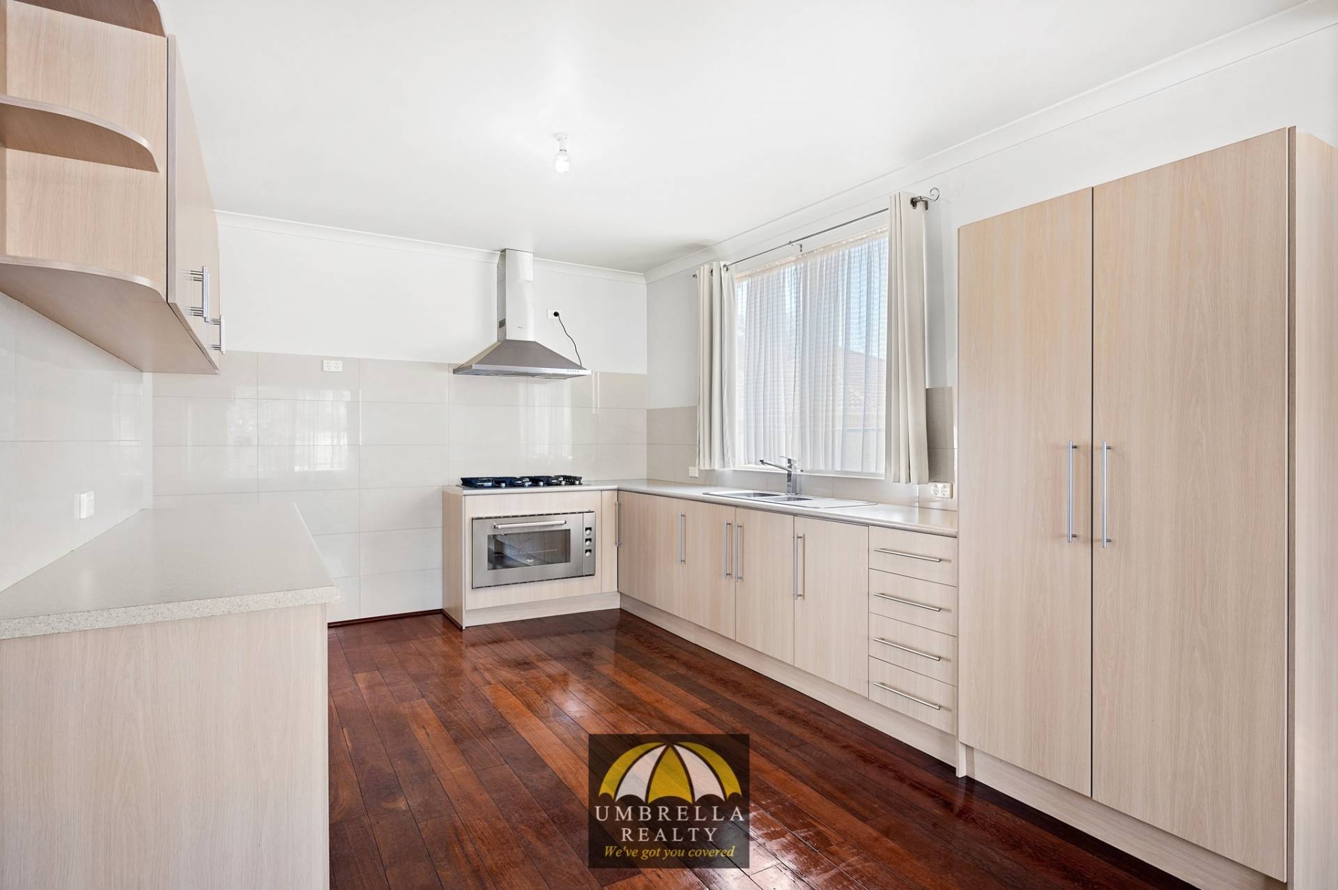 • Modern kitchen with large gas stainless steel cooktop, oven and ample storage space;