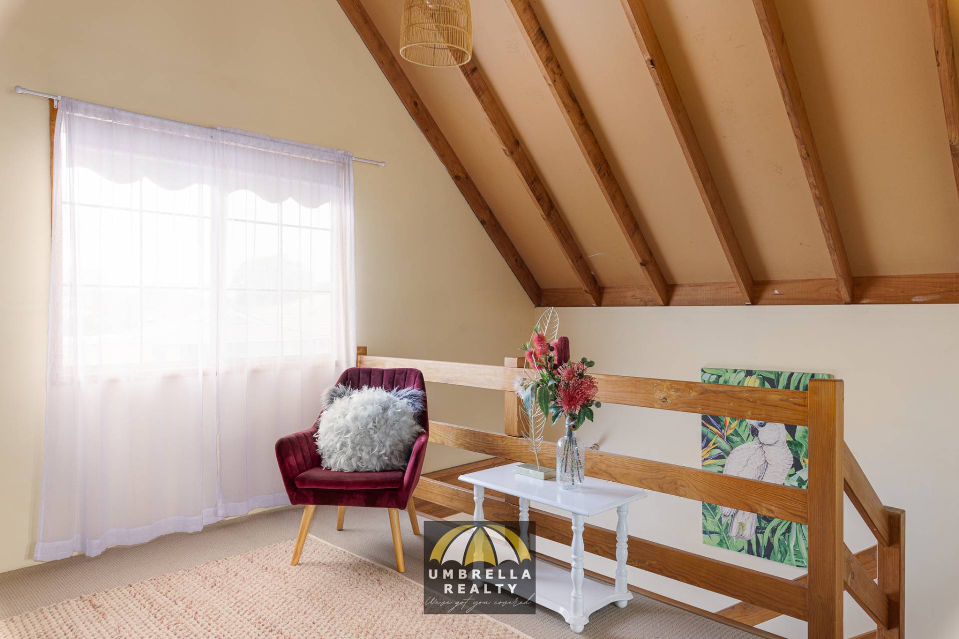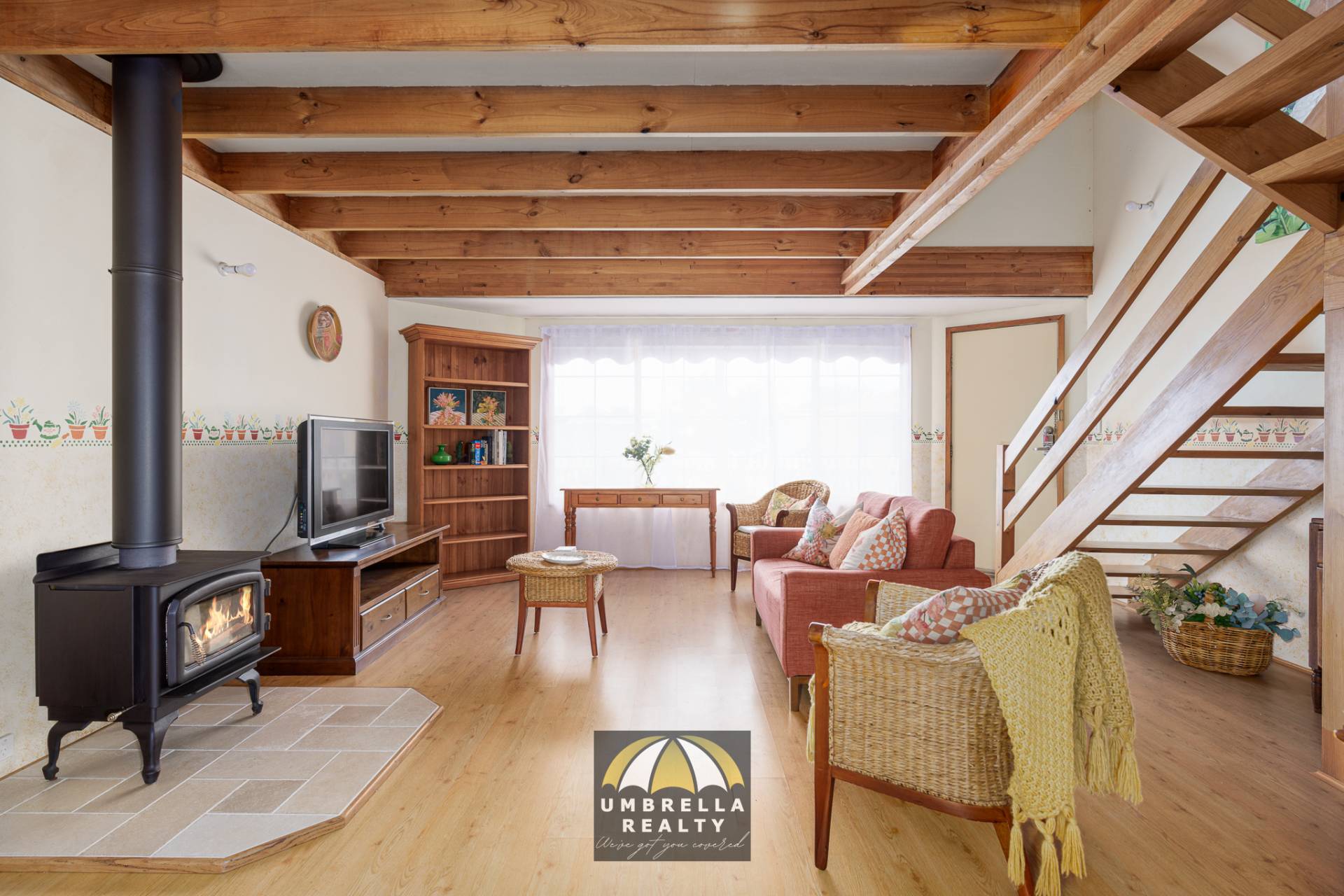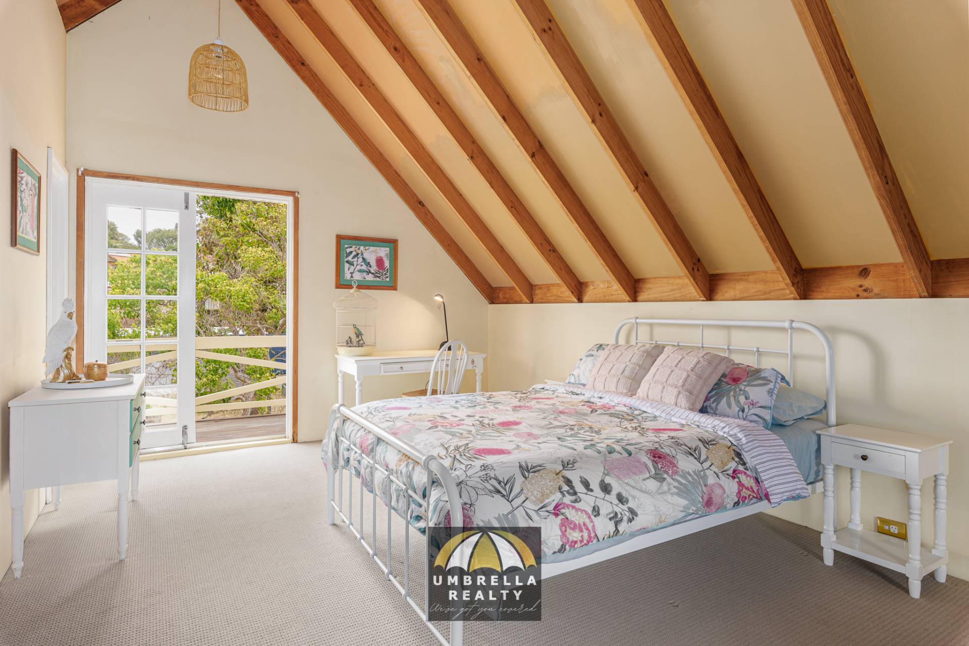 The cozy living area centres around a beautiful wood fireplace, which provides warmth to both the lower and upper levels. The versatile upper level of the home is a standout feature, ideal as a third bedroom or an additional living space. With a walk-in robe, a private bathroom, stunning raked ceilings, and a charming balcony accessible through French doors, this space exudes character and charm.