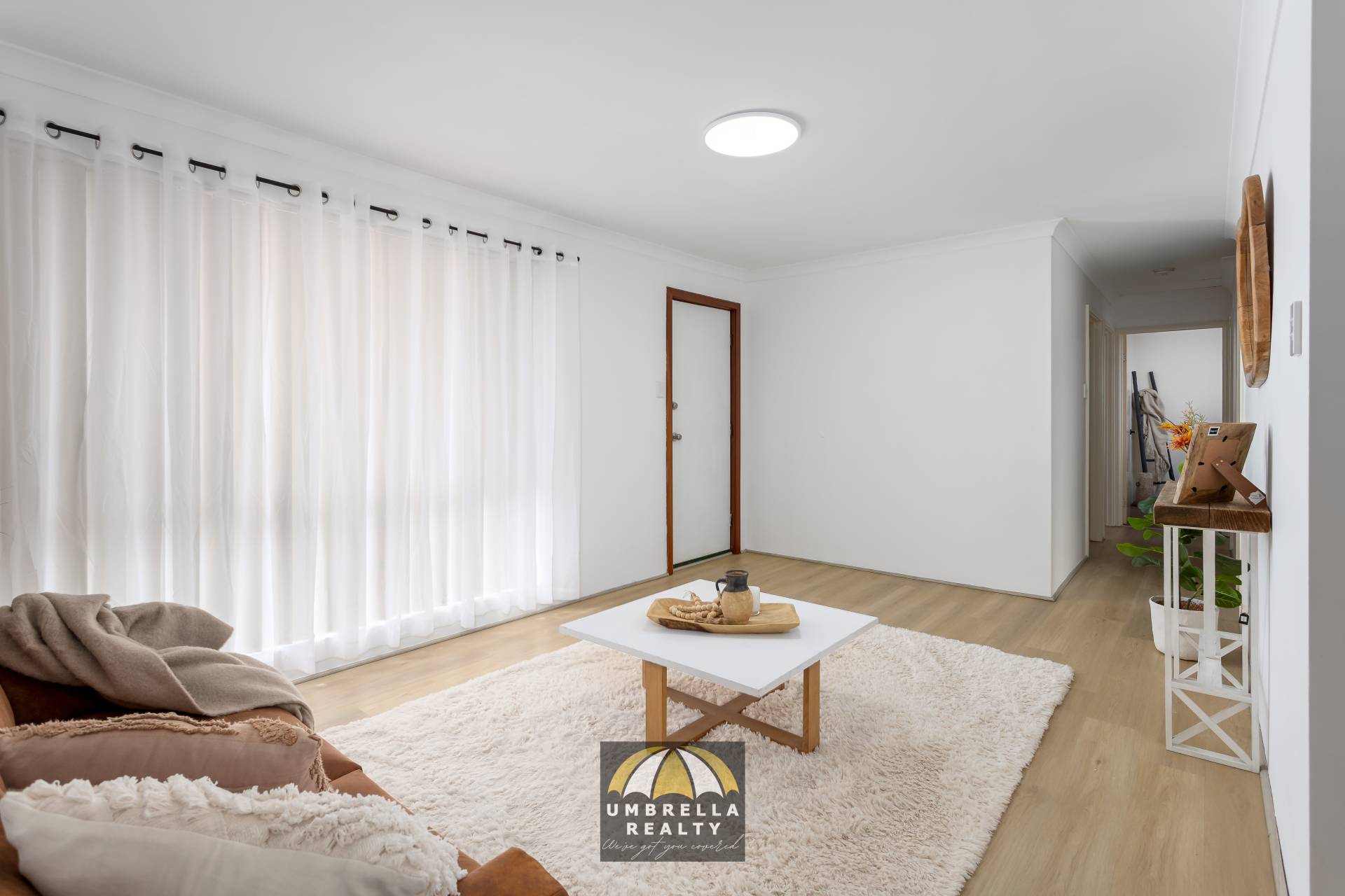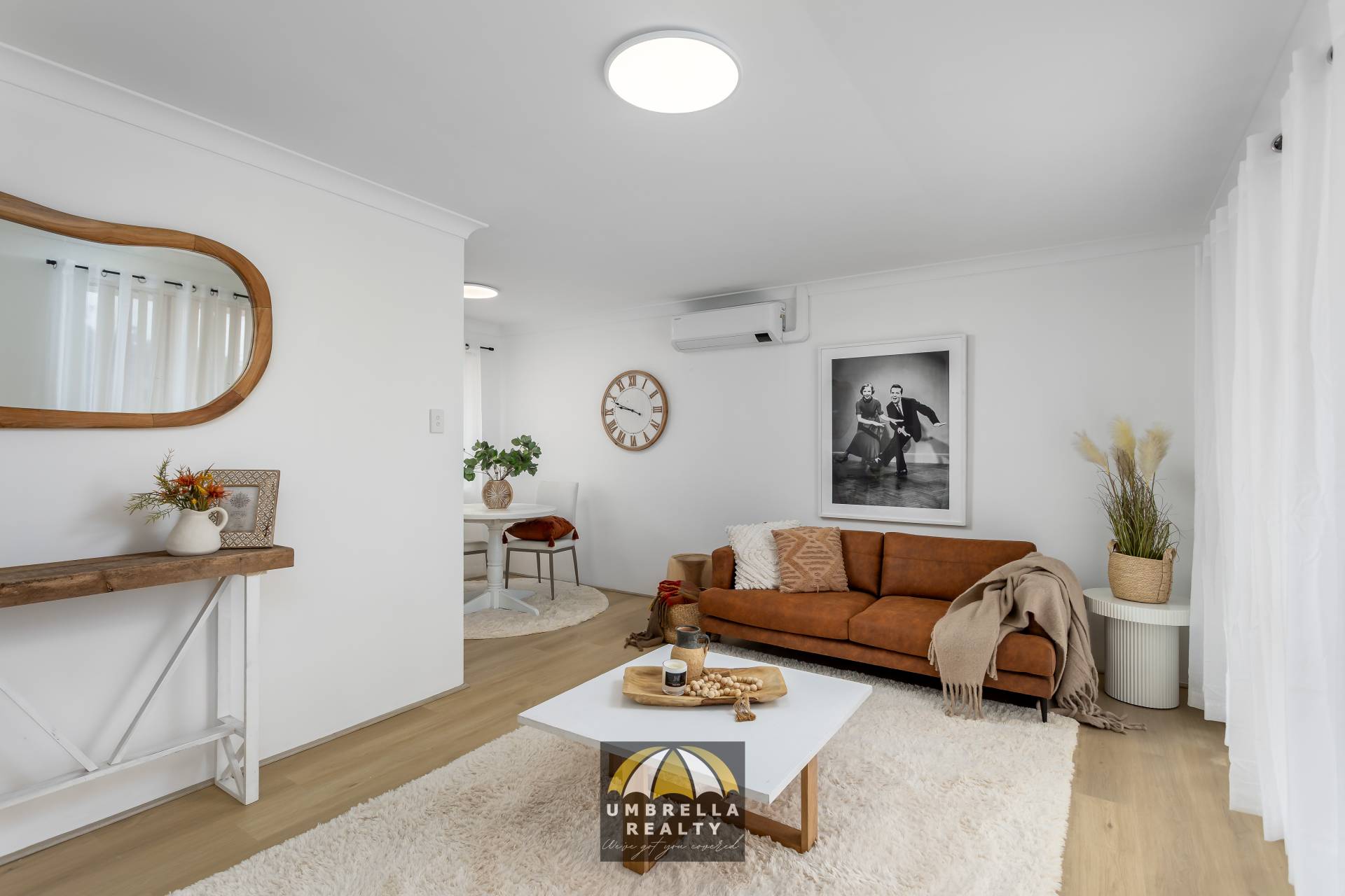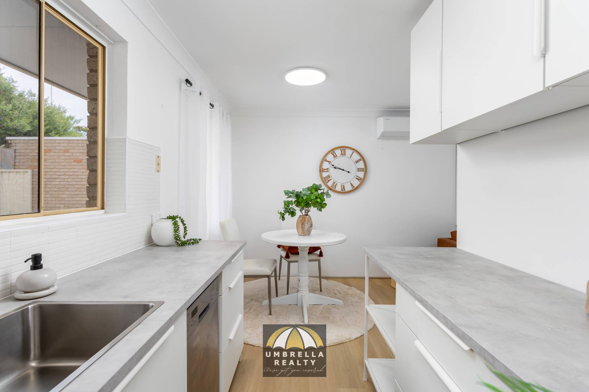 The open plan lounge and dining area is light and bright, enhanced by fresh ceiling paint, LED lighting throughout, and a air-conditioner for your summer comfort.