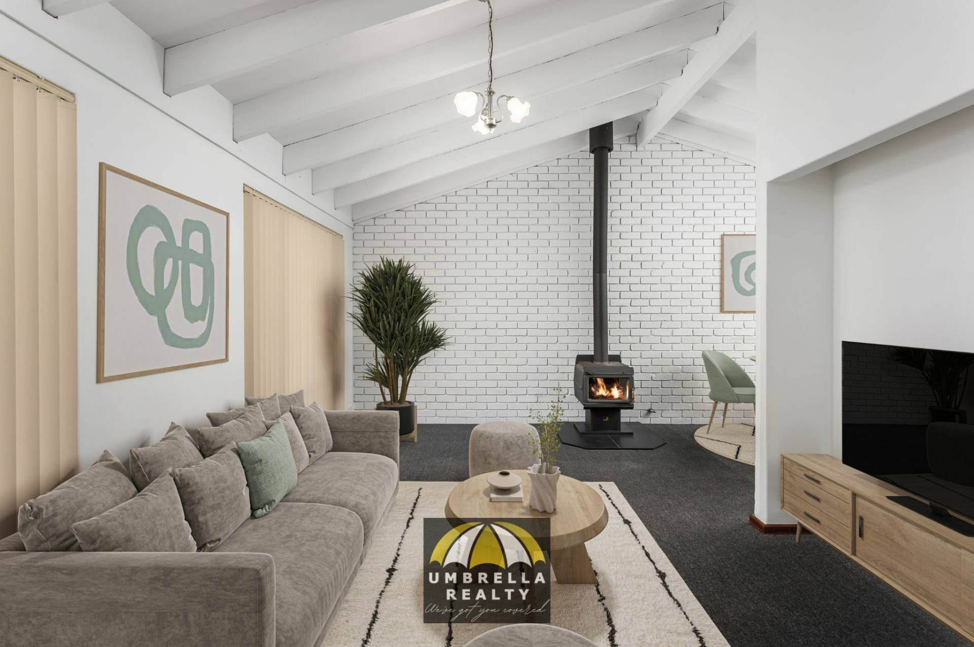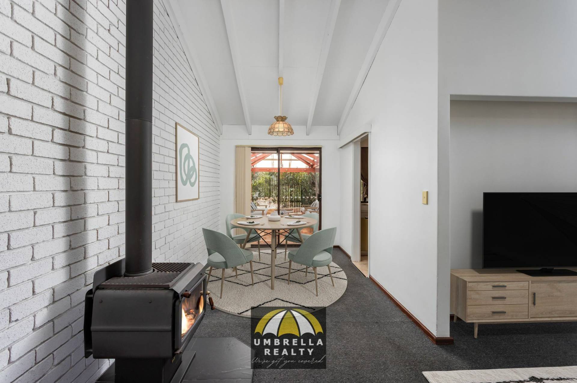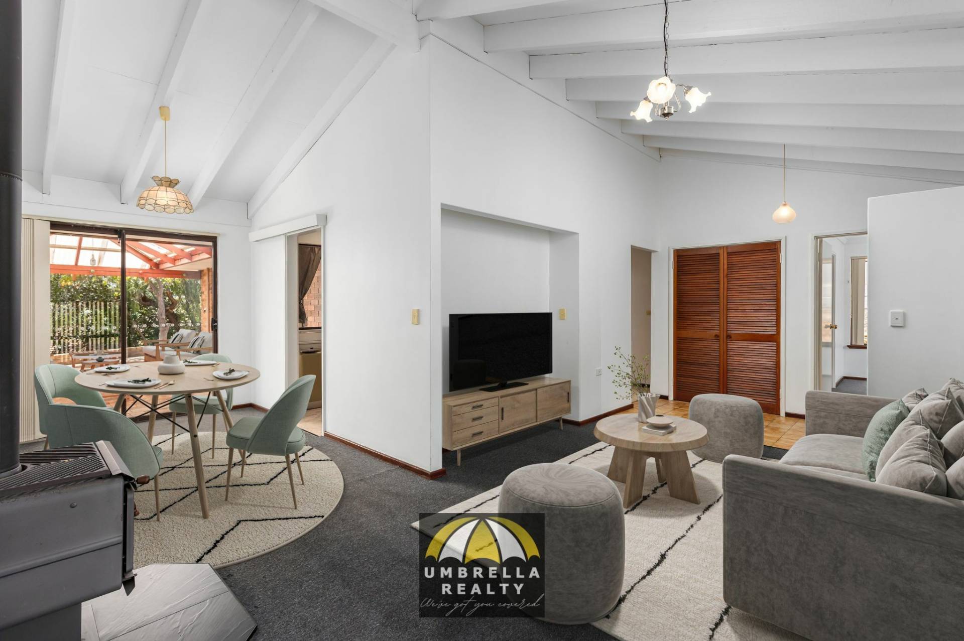 Inside, the home is fresh and inviting, painted crisp white throughout and designed with comfort in mind. The lounge and dining area boasts impressive high raked ceilings and a cosy woodfire heater, enhancing both warmth and atmosphere. The neat and tidy kitchen overlooks a second living area fitted with a split-system air conditioner, offering a versatile and relaxed family space.