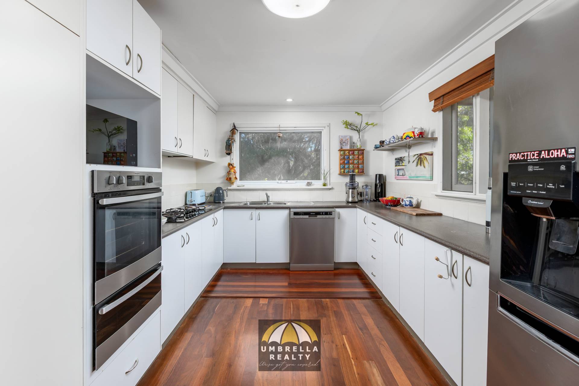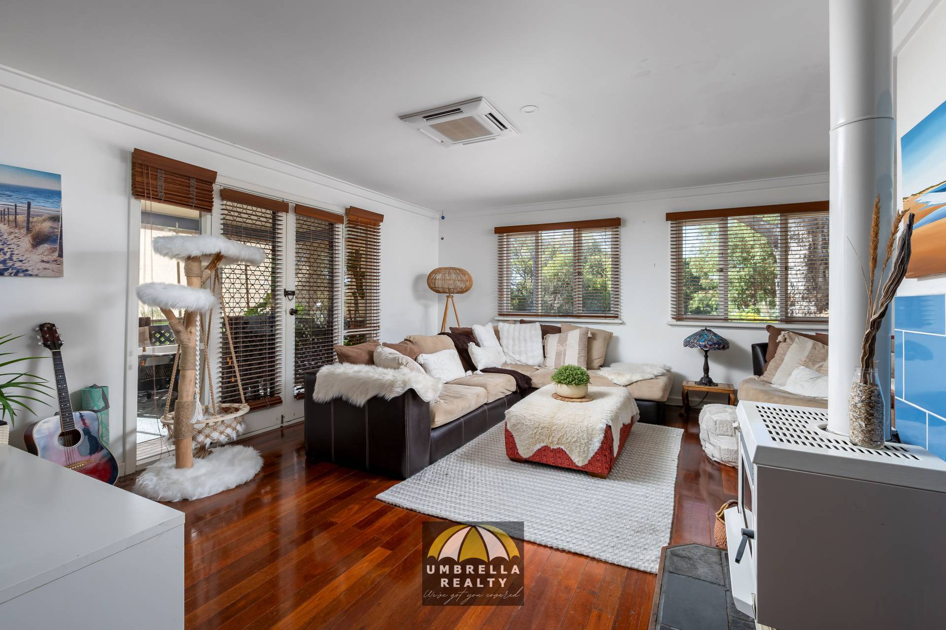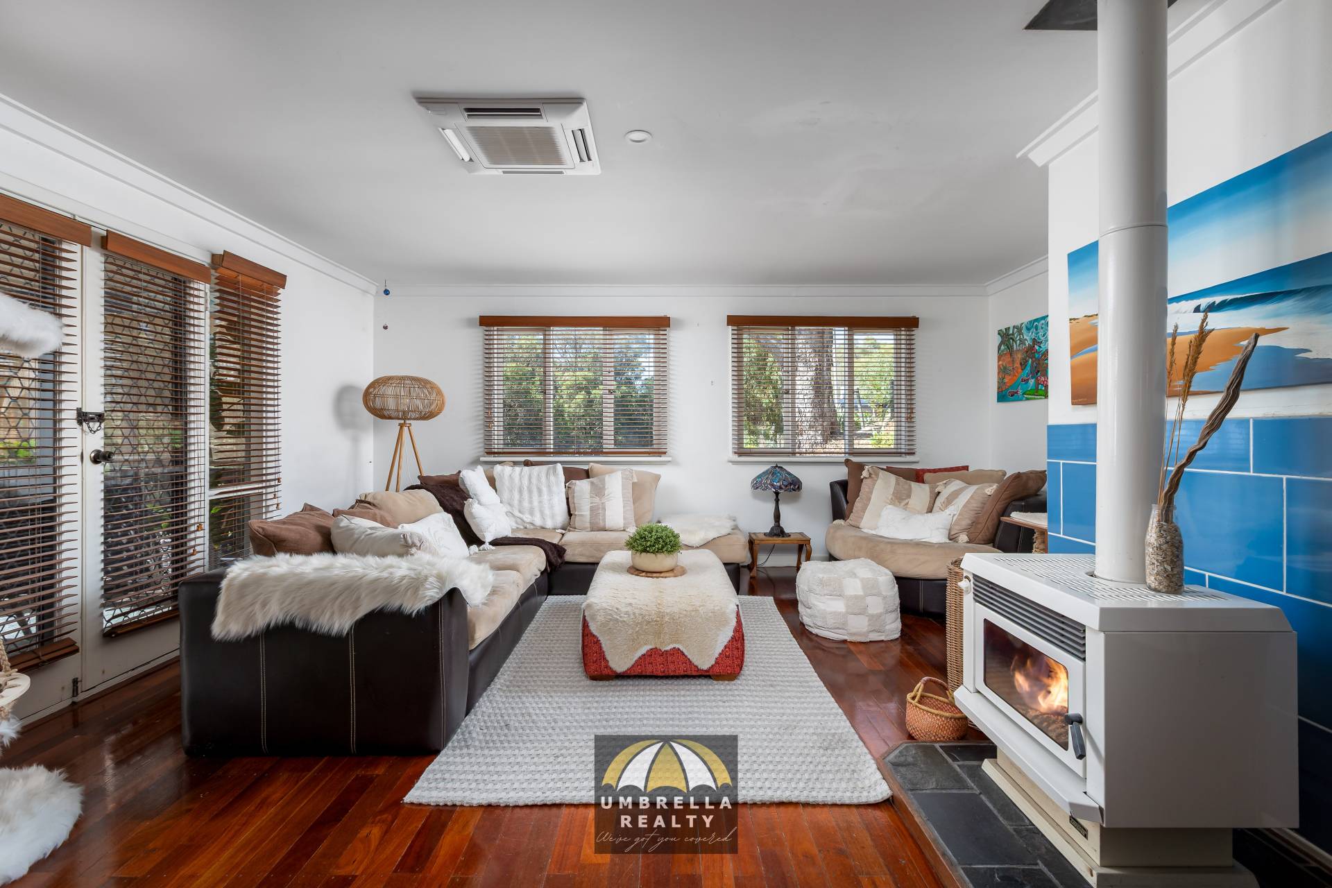 From the moment you step inside the main living level, you’ll appreciate the warmth and charm created by polished jarrah floorboards that flow throughout the living spaces. Sunlight pours through the windows, filling the lounge with natural light and highlighting the welcoming fireplace — the perfect place to gather on cooler evenings while the split system air conditioning ensures year-round comfort. The kitchen is both homely and functional, featuring a dishwasher and a generous 900mm gas cooktop, ideal for preparing meals while staying connected to the heart of the home.