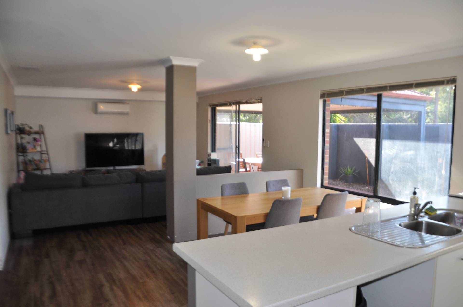 • Open plan kitchen, dining and family room with air conditioning;