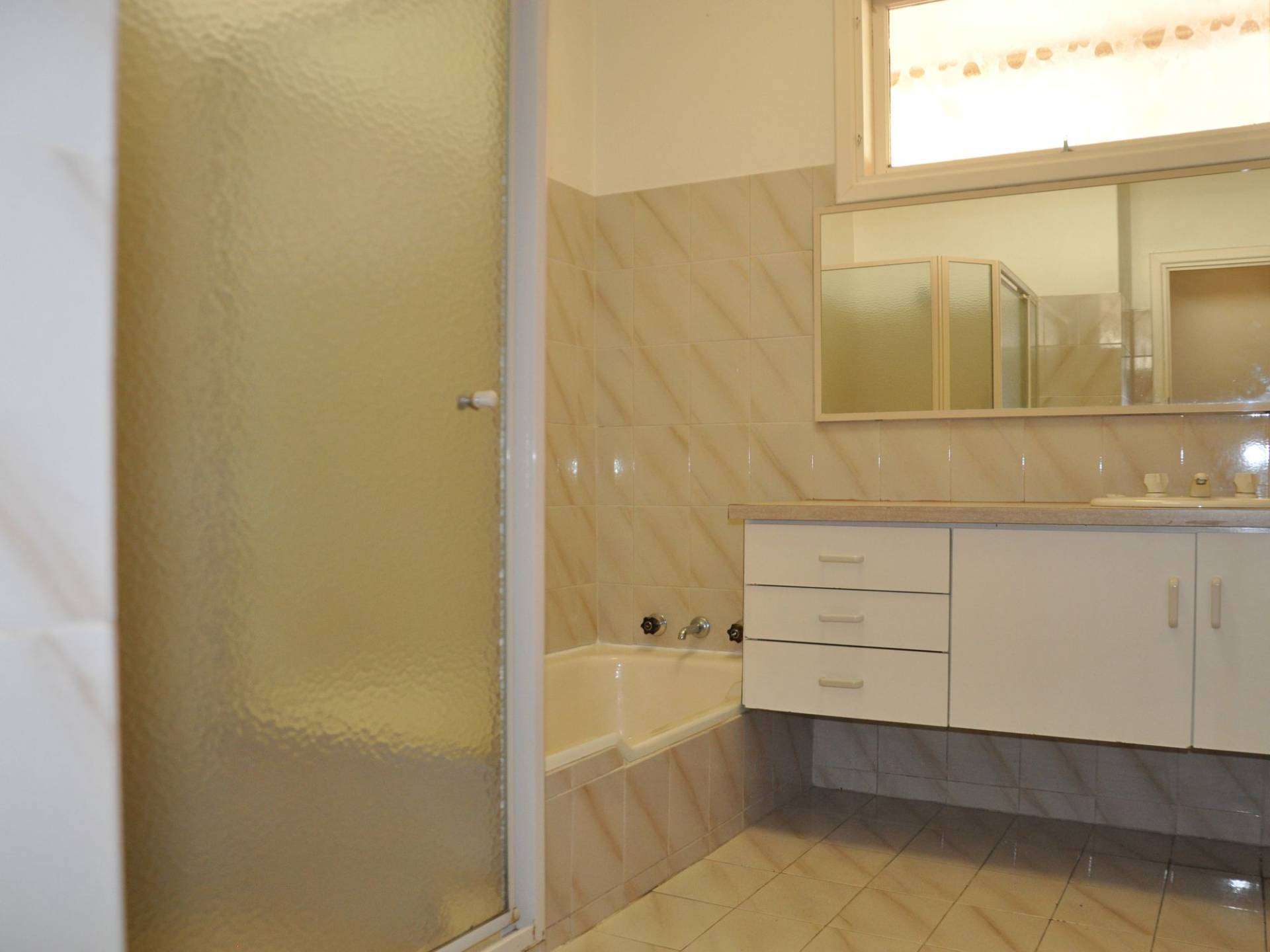 Well sized bathroom with plenty of storage and a bath tub;