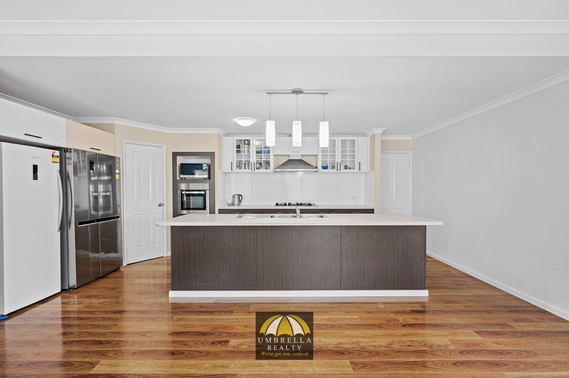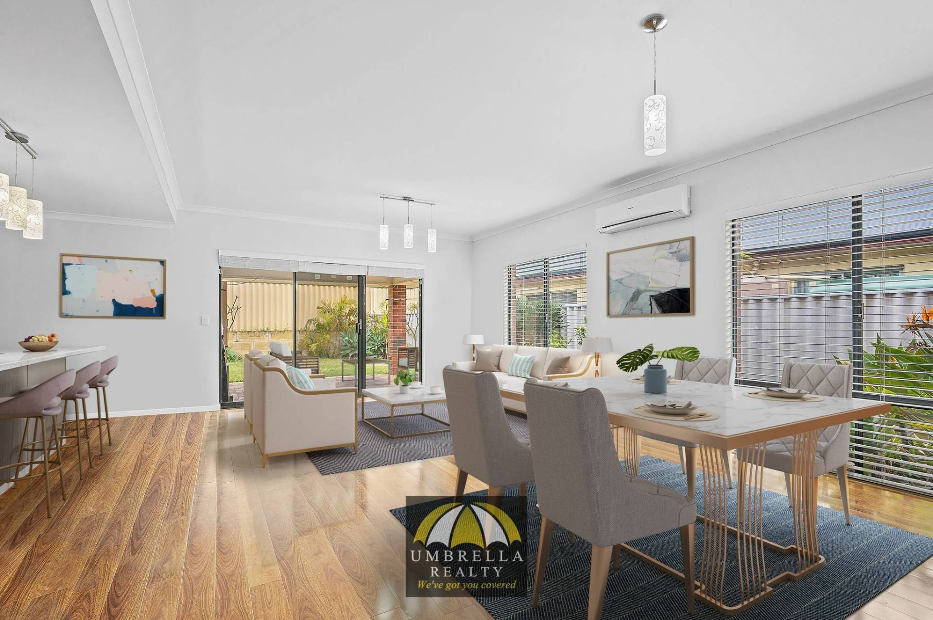 • Open plan kitchen, living and dining room with reverse cycle air conditioner and high ceilings;